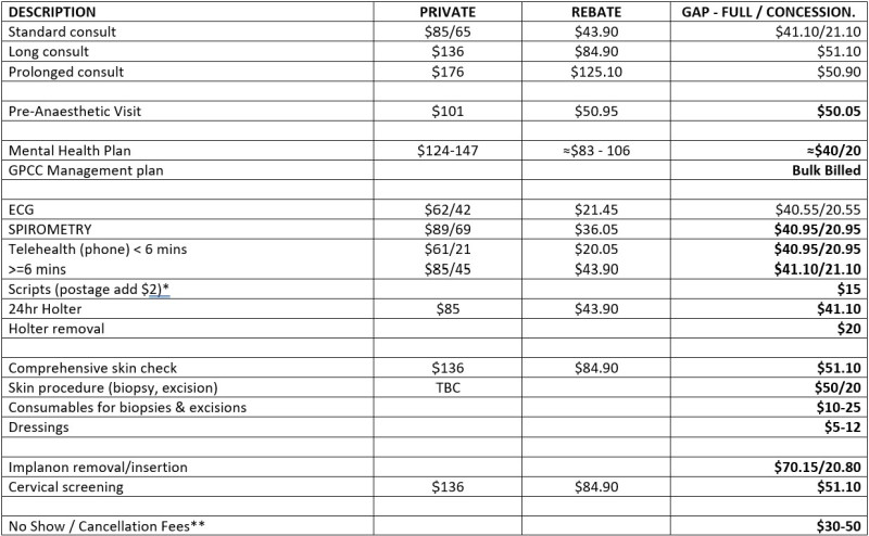 Patients are asked to pay for their visit in full on the day. Exceptions are sometimes made. Full pensioners and healthcare card holders may be charged the Medicare rebate for in-hours consultations with possible additional fees for some procedures in our rooms and for out-of-hours.